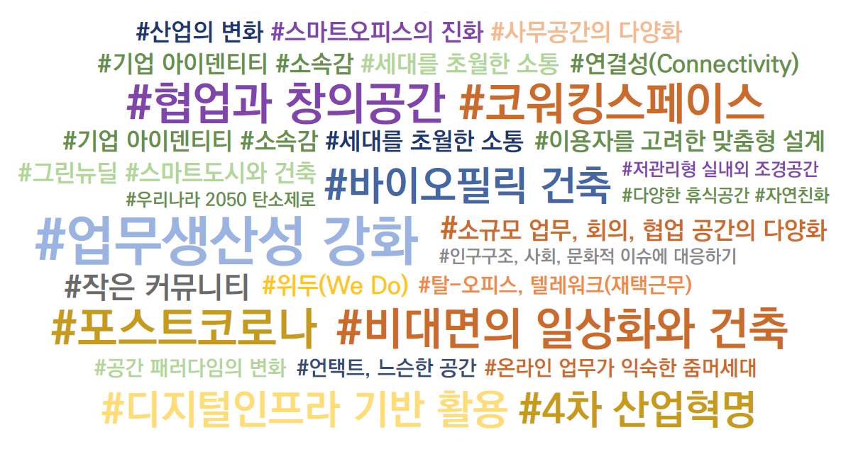 이와 같은 오피스 공간 구성을 통해 실제로 워라밸 만족도와 소통 및 협업이 증가했고, 집중도 도 향상 했다는 결과가 이미 증명 되었다. 하지만 이런 하드웨어와 소프트웨어 사이에, 지금 현재 중요한 것은 코로나이 이후의 물리적 연결성에 대한 심도 높은 고민과 세대별 차이, 성별 차이의 양극화를 해결 할 수 있는 고민이 좀 더 요구 되거나, 필요할 것으로 보인다. 또한 탄소배출관련 이슈도 지속적으로 그 중요도가 증가하고 있기 때문에, 이와 같은 문제 혹은 변화 속에 앞으로 오피스가 가져야 할 방향성을 무엇인지 고민해봐야 한다.