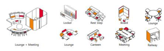 뿐만 아니라 여러 형태로 제공되는 협업공간을 40개 이상 제공하여 구성원들 간의 빈번하고 긴밀한 아이디어 교류 및 소통을 통한 높은 업무성과를 내고자 했다. 오픈 데스크, 라운지 테이블, Railway Carriage, 개방형 회의실, TED 라운지 등 다양한 형태와 크기의 가구를 제공하여 활기찬 업무행위를 유도하고자 했다.