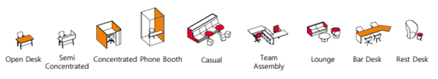 대표적인 리빙 오피스의 구조를 가진 skt의 업무공간은 조합의 다양성을 토대로 분류해 놓은 것이 특징이다. 기본적으로 기업의 5G 연결을 통한 네트워크 구축의 이미지를 강조함과 동시에, 사무공간 내 자율 좌석제, 다양한 협업공간, 깔끔한 연결동선 체계를 가지고 있는 것이 특징이다. 공간은 크게 6가지의 재정의를 통해 분류했다.