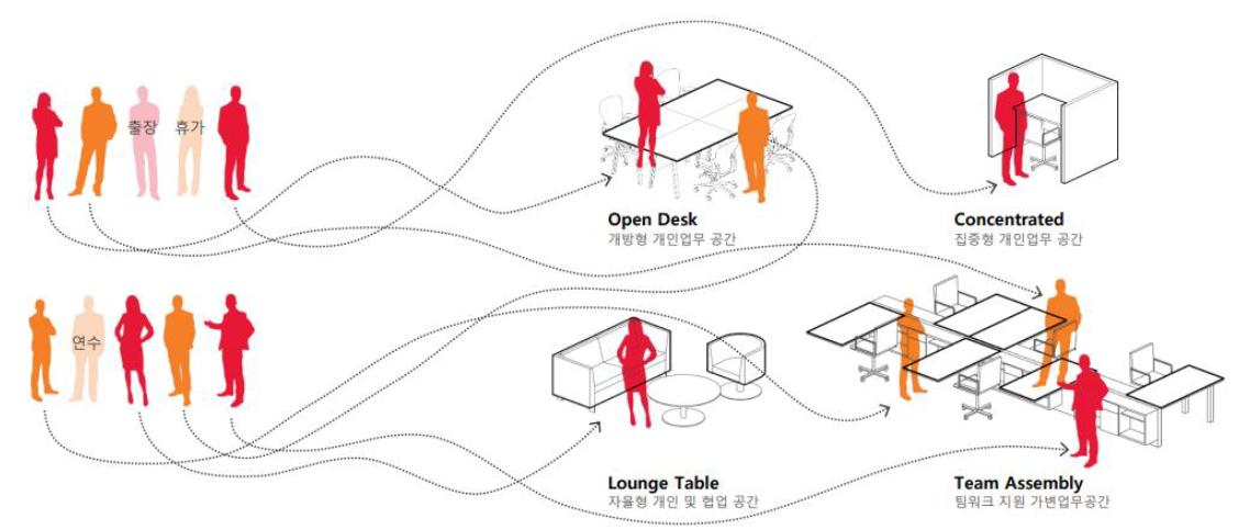 마지막으로 가변적 활용을 고려한 실계획을 통해, 다양한 업무방식과 상황에 맞는 가구배치로 개인업무와 협력업무의 연계를 구현할 수 있도록 계획을 했고, 프로젝트의 성격, 팀의 규모, 사용자의 특성에 따라 쉽게 대응할 수 있도록하는 공간을 만들었다.