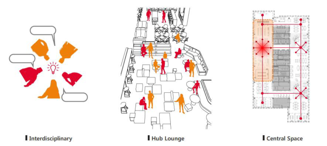 뿐만 아니라 여러 형태로 제공되는 협업공간을 40개 이상 제공하여 구성원들 간의 빈번하고 긴밀한 아이디어 교류 및 소통을 통한 높은 업무성과를 내고자 했다. 오픈 데스크, 라운지 테이블, Railway Carriage, 개방형 회의실, TED 라운지 등 다양한 형태와 크기의 가구를 제공하여 활기찬 업무행위를 유도하고자 했다.