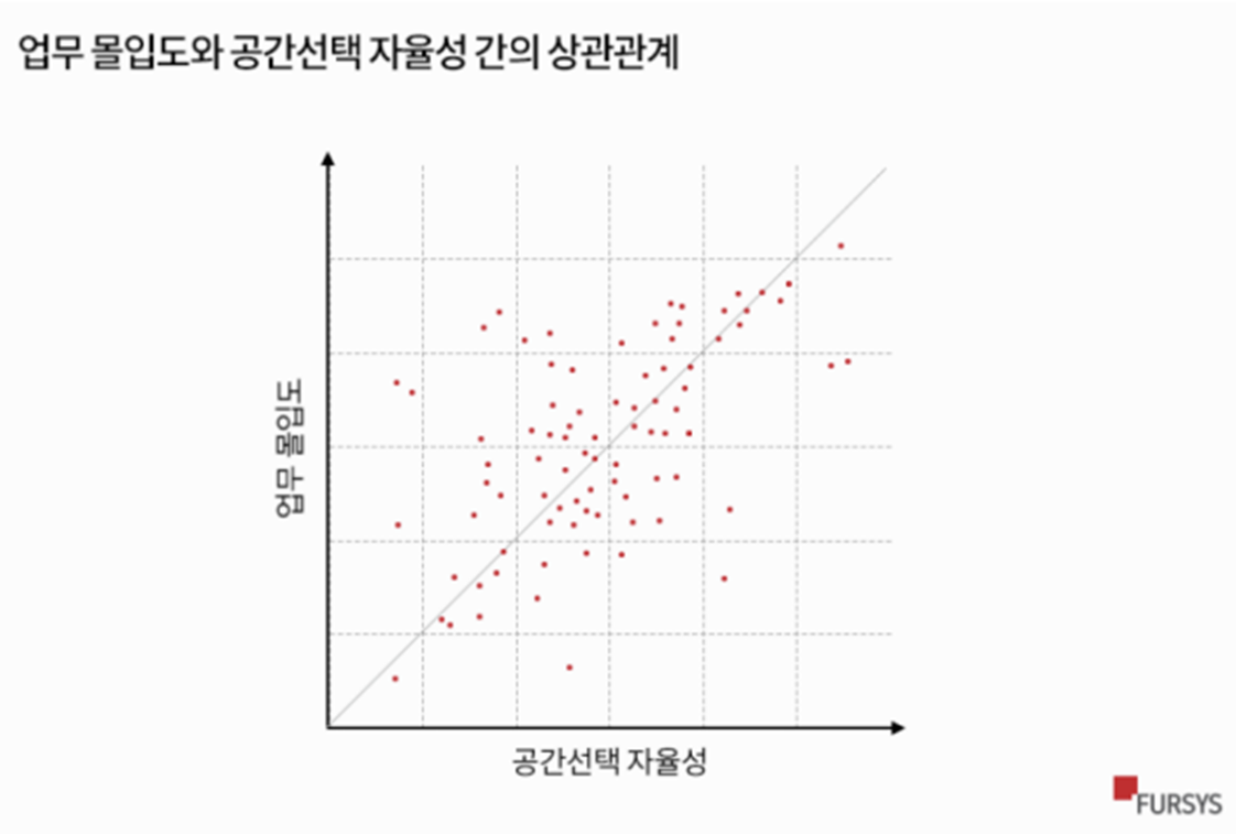 공간 형태의 자율성이 높을 수록 업무의 몰입도가 높아질 것인가에 대한 연구 및 상관관계의 조사는 몇 차례 조사 된 바 있다. 대표적으로 퍼시스에서 제공하는 자료 지표가 그 타당성을 뒷받침해준다. 스마트 오피스와 더불어 함께 대두되고 있는 것 중 또 다른 오피스의 유형은 '리빙오피스'가 있다. 스마트 오피스 기반에서 고정형 오피스 공간이 아닌, 변화에 더 쉽고 건물 자체가 변화 할 수 있느 구조를 가진 오피스를 소위 우리는 리빙 오피스라고 부르는데, 이를 통해 새로운 세대의 가치인 수평성, 투명성, 공정성을 충족하는데 적합할 것이라는 생각이 든다.