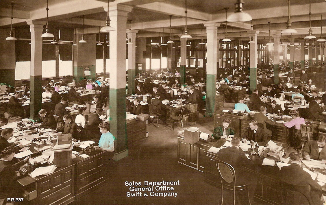 업무시설도 경제와 사회의 변화에 따라서 다양하게 변해 왔는데, 우선 산업화와 자본주의의 경제 발전에 따라 1900년대 대형 오피스가 등장했다. 철도, 전신의 보급으로 원거리 이동과 통신 기능의 발달로 재화를 판매 할 수 있는 범위가 넒어지면서 문서작성이나 전화를 받는 사무직 노동자가 자연스럽게 같이 증가 하게 되었다. 이러한 수요를 충족하기 위해 업무 지시 감독을 위한 대형 공간이 필요하게 된것이다.