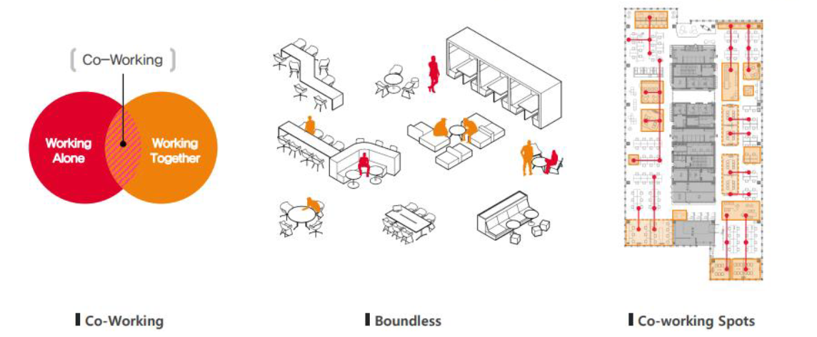 대표적인 리빙 오피스의 구조를 가진 skt의 업무공간은 조합의 다양성을 토대로 분류해 놓은 것이 특징이다. 기본적으로 기업의 5G 연결을 통한 네트워크 구축의 이미지를 강조함과 동시에, 사무공간 내 자율 좌석제, 다양한 협업공간, 깔끔한 연결동선 체계를 가지고 있는 것이 특징이다. 공간은 크게 6가지의 재정의를 통해 분류했다.