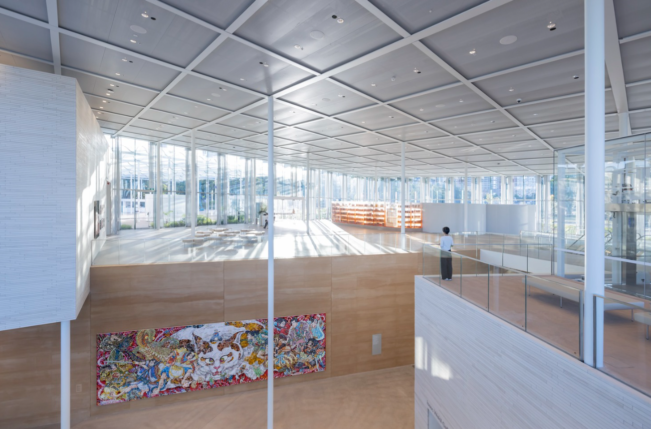 갤러리로 들어가면 수직으로 관통하는 아트리움을 마주하게 된다. 전시 공간의 매스뿐만 아니라 계단, 엘리베이터, 가구, 기프트숍은 그 존재를 분명히 드러낸다. 세지마의 사이순칸 세이야쿠 여성 기숙사 (1991)의 아트리움을 연상시킨다. 하지만 아트리움 외 공간까지 함께 보면 두 건물의 유형은 전혀 다르다. 오히려 80년대 말 세지마가 설계한 곡면 캐노피, 혹은 분절된 캐노피 하부에 다양한 가구와 공간을 교차하여 배치했던 플랫폼 시리즈와 유사하다. 캐노피의 단면이 노출되어 구조와 두께를 인지할 수 있을 뿐만 아니라 캐노피 위를 야외 데크 삼아 거니는 관람객을 실내에서 볼 수 있게 설계되어 그 존재감을 강하게 드러내는 것도 같은 맥락이다.