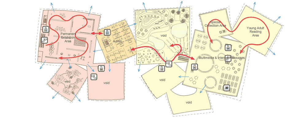 시드니 미술관의 평면과 단면은 사실 다른 현상 공모에서도 본적이 있다. 사나의 타이중시티 문화센터 공모 였는데, 그 당시에도 매스의 중첩을 통해서 계획안이 나왔었다. 평면과 단면의 유사성에도 불구하고 시드니 미술관의 명확한 차이점은 매스가 아니라 지붕과 데크 둘다 겹쳐 있는 파빌리온의 중첩이라는 점이다.