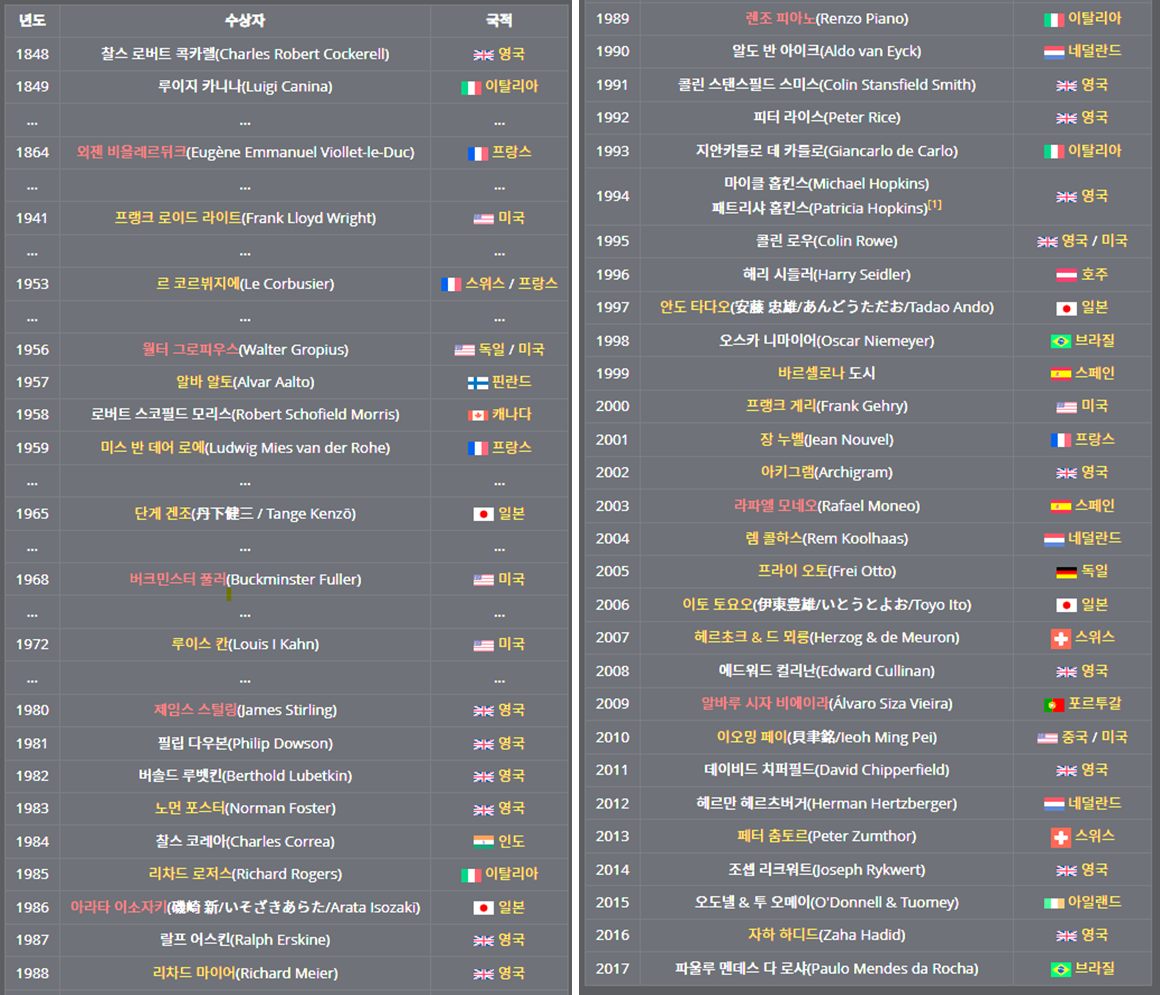돈이 모이는 미국에 상이 있다면, 역사가 긴 유럽에도 건축상이 있다. 바로 RIBA 금메달이다. 영국 건축가 협회에서 매년 우수한 건축가들에게 주는 상으로 영국 사람뿐만 아니라, 다른 유럽 사람, 일본 사람도 있다. 1848년도부터 시작한 영국 건축상은 미국보다는 역시 역사가 길다.