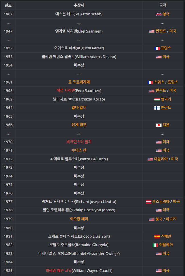 우수디자인 건축물을 정의하는 것은 참 어렵다. 외관이 좋아보이는게 우수 디자인인 것인지, 공간적 구성이 우수디자인 건축물인지 시공의 방식으로 인해 우시 디자인 건축물인지 기준이라는 게 뭔지 알 수 가 없다. 사람마다 취향도 다르다. 하지만 기준이라는 것을 정한다고 한다면, 우리는 보통 어워드를 많이 떠올리곤 한다. 특히 국제적인 상. 미나리나 기생충 같은 영화들도, 국제 영화제에서 수상을 하고 나니 우수한 영화로 모두에게 인정받는다. 그렇다면 건축도 이런 영화처럼 인정받을 수 있는 상들이 얼마나 있고, 기준을 무엇일까에 대한 궁금증을 갖게 된다. 크게 건축상인데 국제적인 상으로는 3가지가 있다. 첫번째로 AIA 금메달이 있다. 미국 건축가 협회에서 주는 상인데, 미국인만 받을 수 있는 것은 아니다. 프랑스 사람도 있고, 핀란드 사람도 있다. 새로운 공간을 창시 한 사람 새로운 건축 유형을 만든 사람들에게 협회에서 선정한 후 상을 준다. 미국 치고 역사도 짧진않다. 1907년도 부터 시작해서, 건축공부를 한 사람들이라면 모두가 아는 건축가들에게 금메달을 수여했다.