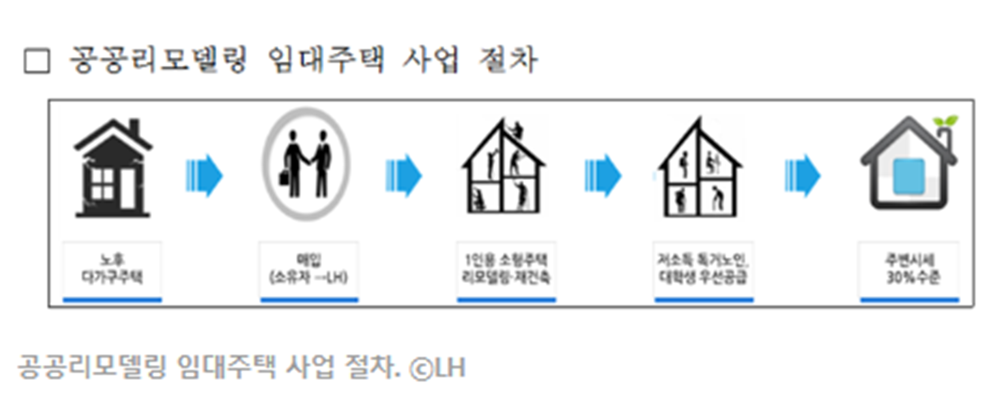 뿐만 아니라 노후주택을 리모델링 할 경우, 공공에 도움되는 큰 장점이 있다. 노후 주택 중 다가구 주택을 LH가 매입해서, 1인용 소형 주택으로 리모델링 및 재건축을 하고, 이를 저소득 독거노인이나 대학생 우선 공급을 통해, 저렴한 가격으로 공공에 주거를 공급할 수 있다는 장점이 있다.