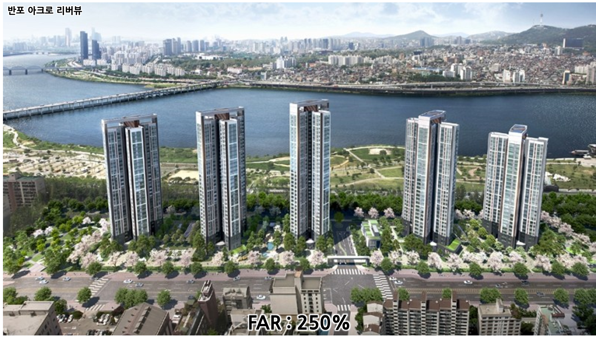 과거에 지어진 압구정 아파트에 용적률은 200%, 준공된지 얼마 안된 반포 아크로 리버뷰는 250%의 용적률을 가지고 있다. 어떤게 더 좋을까. 높게 높게 지어서 전체적인 땅의 쾌적함을 주는 것이 유리 할까, 경관적인 측면에서 도시의 레벨을 맞춰 가는 것이 좋을 까. 물론 압구정 때는 높이 제한이 있었다.