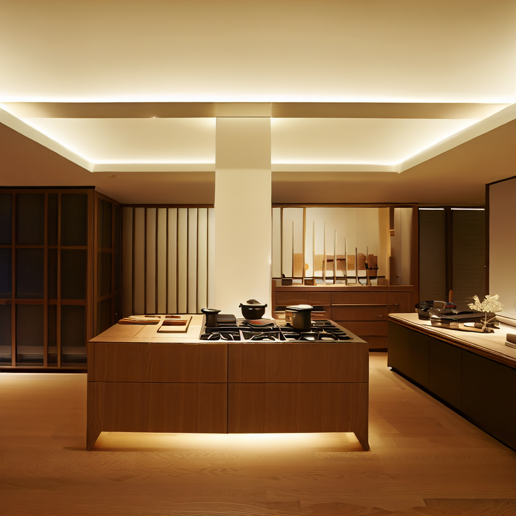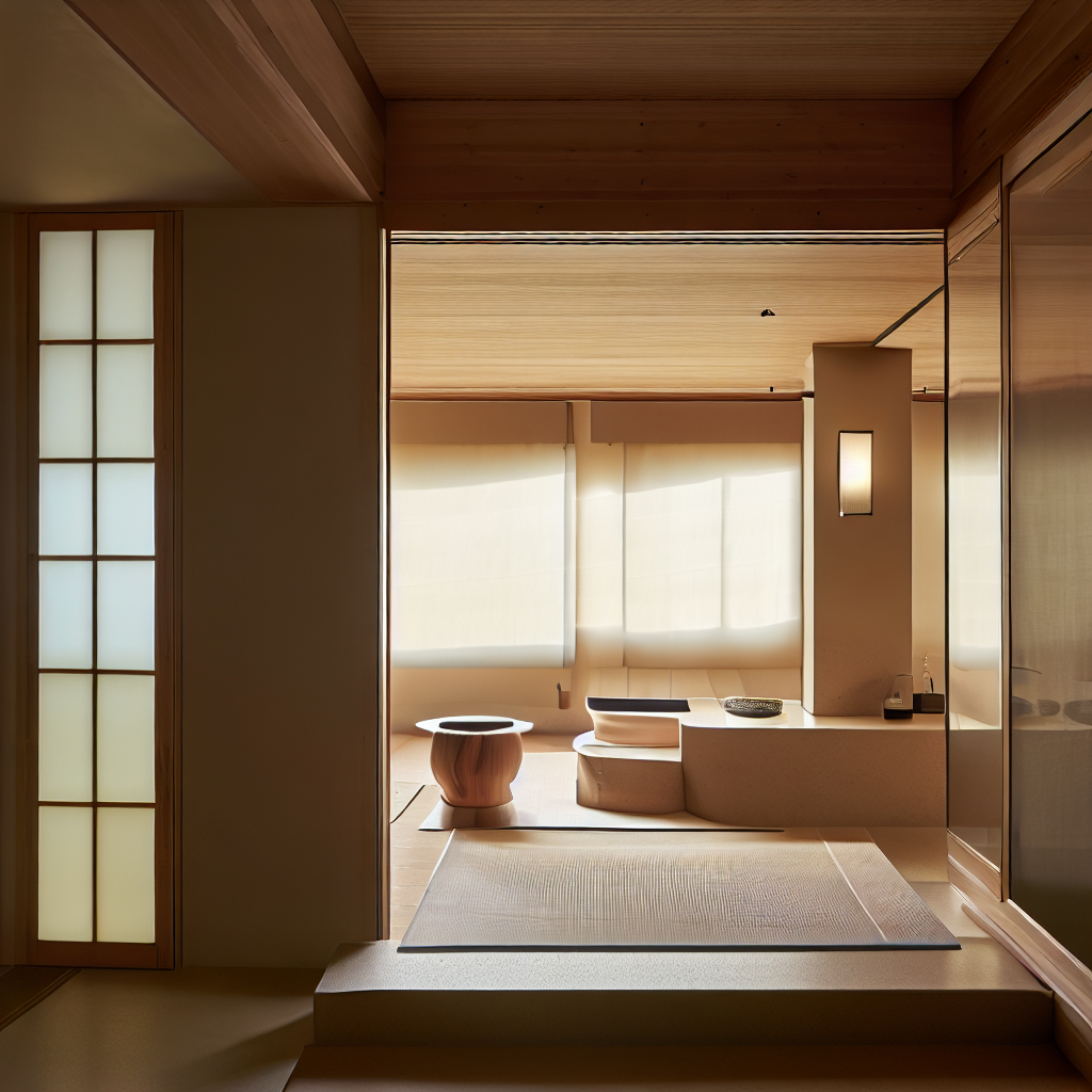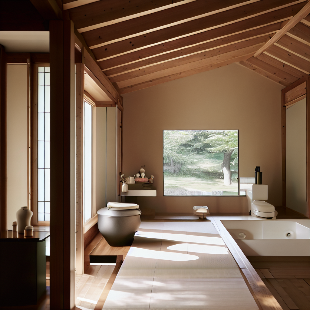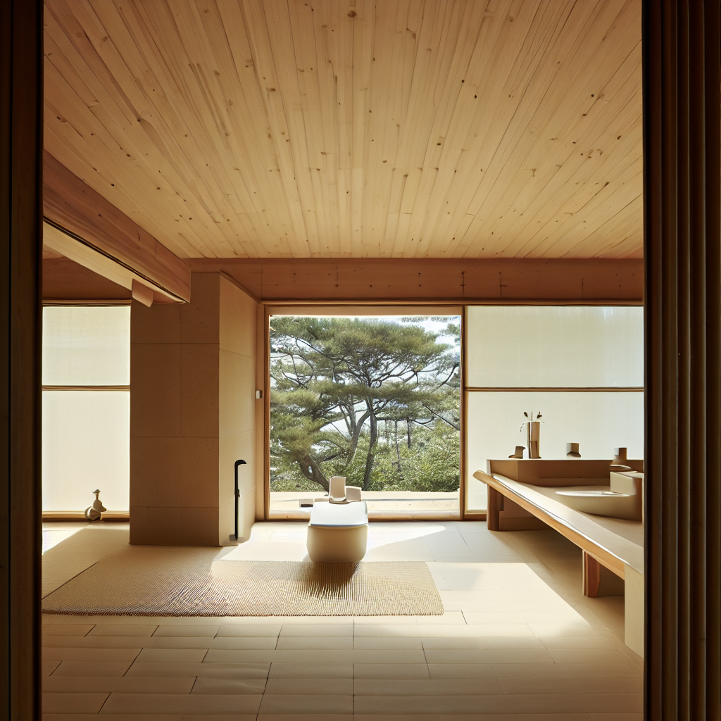 한국식 욕실을 ai는 한옥에서 많이 가져오긴했나보다, 프레임속에 소나무라니 놀랍다. 하지만 변기의 위치나 욕조의 위치는 정말 잘못되긴했다. 그래도 뭔가 욕실과 방 사이의 문지방같은 부분들이 흥미롭다. 그리고 저 한지같은 불투명의 하얀 창문도 정말 인상적이다. 치퍼필드의 디자인이라고 한다면, 그 이미지를 표현하는 구도가 비슷한 것같다. 가까운 부분은 어둡고 방을 들어서는 부분부터는 밝아지는 표현이 이미지를 극적으로 만드는 것 같다.