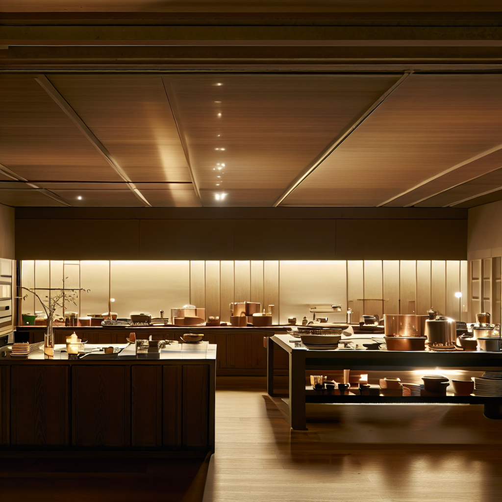 거실과 마찬가지로 공간을 구성하는 3차원적 기본요소들은 한국의 스타일을 택했다. 그리고 조금 편견이라 생각 되는 부분은, 항아리?같은 팟의 사용 이다. 치퍼필드의 스타일로는 역시나 가구의 배치 구성이나, 조명의 사용이 인상적으로 보인다. 그리고 그 다양한 원목사용, 매립된 조명이 정말 깔끔하다.