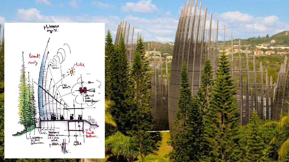 카낙의 전통 건축에서 영감을 얻고, 목조와 금속의 조합으로 건물의 골조를 형성한 사례로, 꺄즈 모양의 문화센터 건축물은 미래의 기술과 전통재료의 접목으로 만들어진 건축물이다. 바람을 고려한 설계와, 초목으로 둘러 쌓여 있는 점을 고려하여 설계했다.