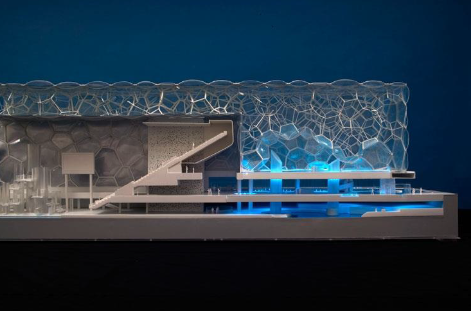 축구장 10배 면적의 큰 건물이지만 기둥이 없고 비누거품 모양의 건축물이 건물 전체를 지탱하고 있다. 일정한 부피를 곡면 형태의 최소 면적으로 팽팽하게 감싸혹 있어, 가장 안정적인 구조를 갖고 있다. (표면적을 가장 작게 하면서 튼튼한 구조) 워터 큐브는 이런 비누거품 모양을 기본 구조로 만들어 안정성을 극대화 한 사례로, 합성수지인 ETFE를 건축 외피 재료로 선택해, 건물이 받는 태양 에너지의 90%를 흡수하여 난방으로 사용한다.