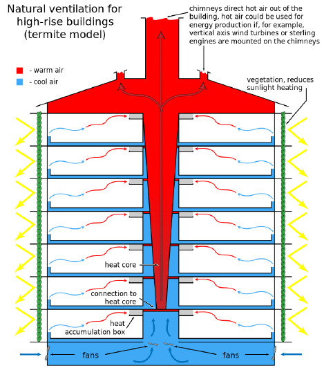 쇼핑센터와 업무시설인 건물의 에너지 사용을 줄이기 위해 방법을 모색하던 중, 흰개미 집의 실내 온도가 외부보다 낮다는 사실을 발견해 흰개미집의 자연환기 원리에서 착안하여 38도가 넘는 대낮에도, 실내 온도를 24도로 유지