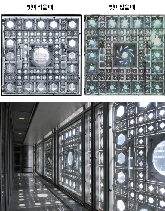 전통적인 격자문양인 아랍 전통문양을 유리, 알루미늄, 철재를 사용한 재료들로 외피를 구성