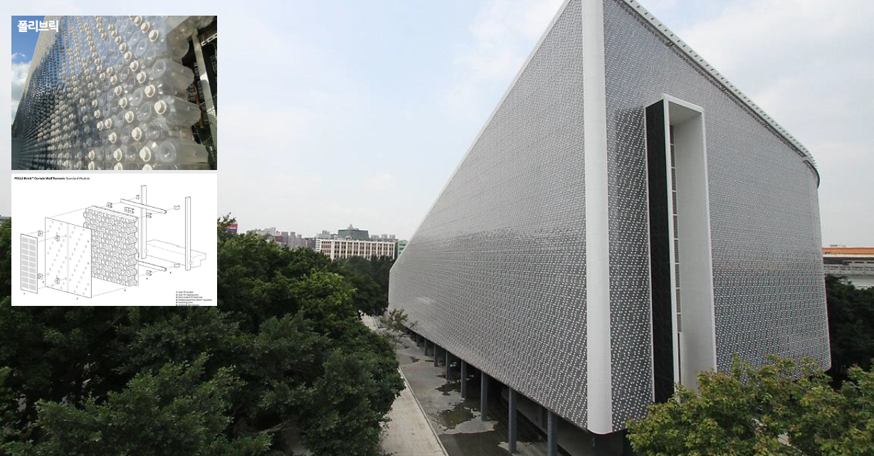 150만개의 재활용 페트병을 활용해, 폴리브릭이라는 벽돌 대체재를 개발하여 건물의 외관을 만들 었다. 다각형의 폴리브릭은 접착제가 없이도 정교하게 서로 맞물려 지지력을 강화할 수 있으며, 일반적인 건축물 무게의 50%정도 밖에 나가지 않는다. 9.0강진과 태풍 등 자연재해에도 충분히 견딜 수 있고, 방음과 단열효과까지 높아 에너지 절감이 가능하다. 빛을 투과하는 페트병의 특징을 활용해 낮에는 조명이 필요 없고, 밤에는 페트병에 삽입한 LED로 조명 역할을 한다.
