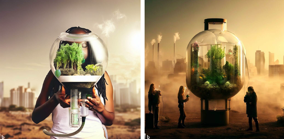 [TEXT] Againt the background of a deserted city, people using ad terrarium type air purification system create a beautiful and healthy living environment in which nature and techonology are fused, creating a unique and eco friendly look.