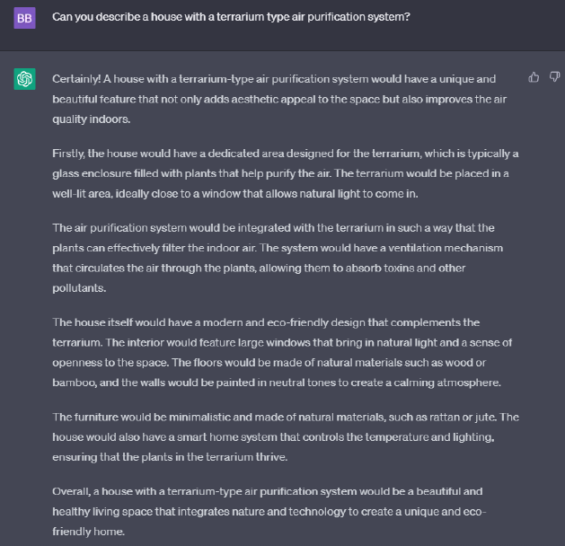 [TEXT] a house with a terrarium type air purification system would be a beautiful and healthy living space that integrates natures and technology to create a unique and eco friendly home.