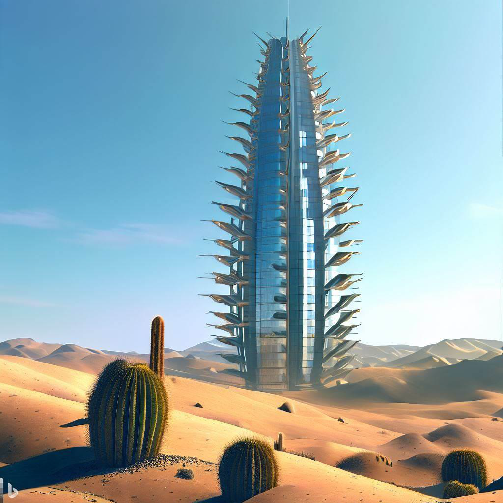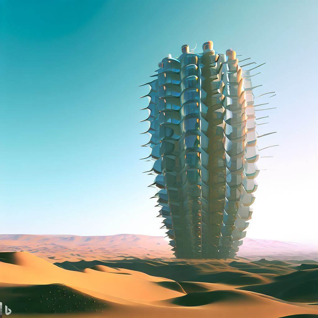 + skycraper collecting water like cactus , building exterior consisted of hard shell and thorn.