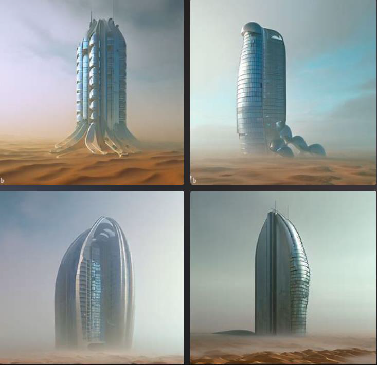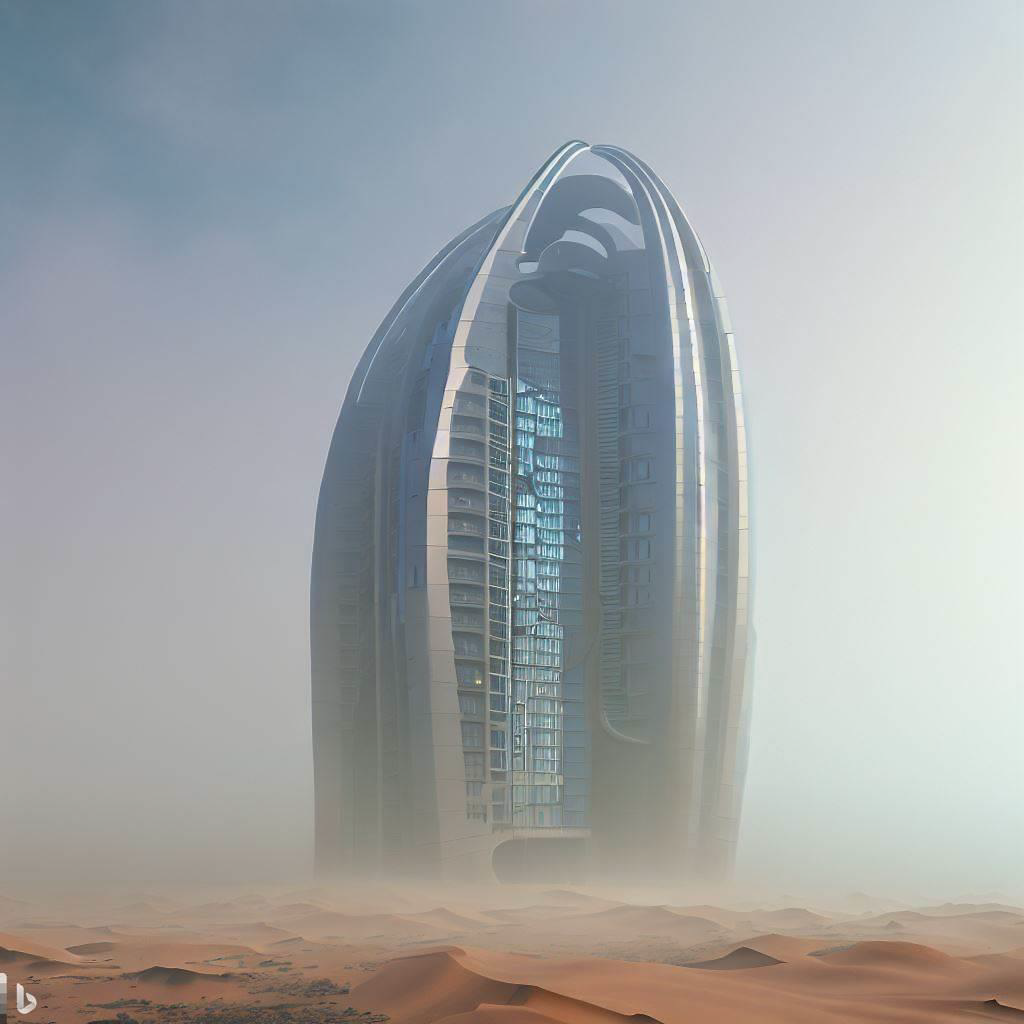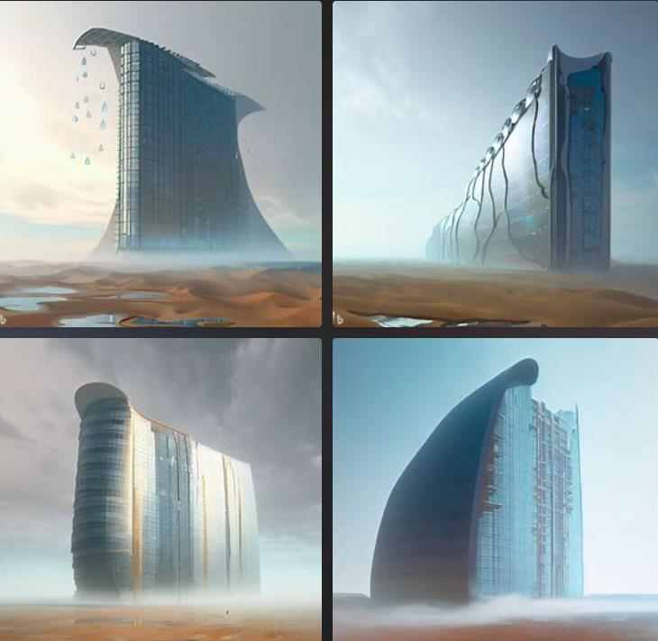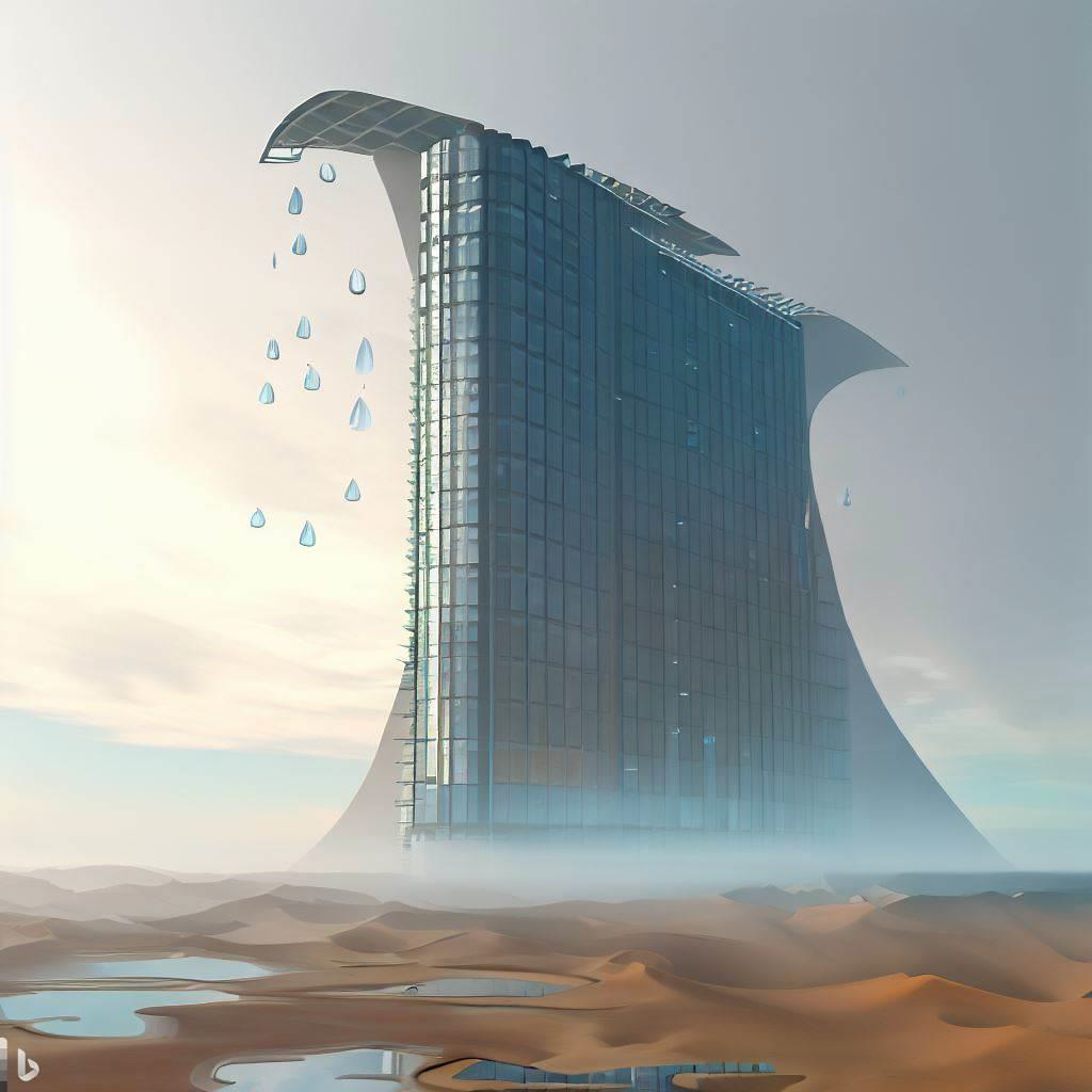 [TEXT] digital art , 3d render , skyscraper in gobi desert + skycraper collecting water like namib desert beetle , building exterior consisted of Hydrophilic panel and hydrophobic panel.