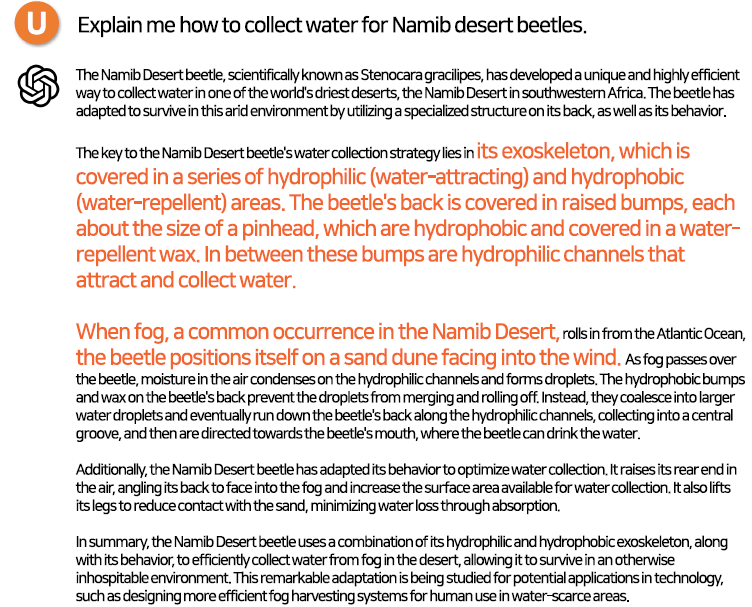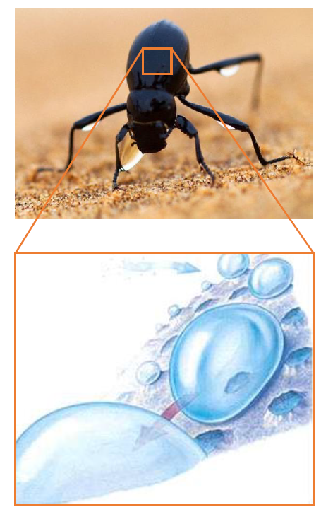 - 친수정 돌기와 발수성 돌기를 통한 물방울 형성과 이를 따라 딱정벌레의 입으로 물이 흐름.