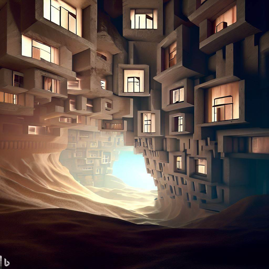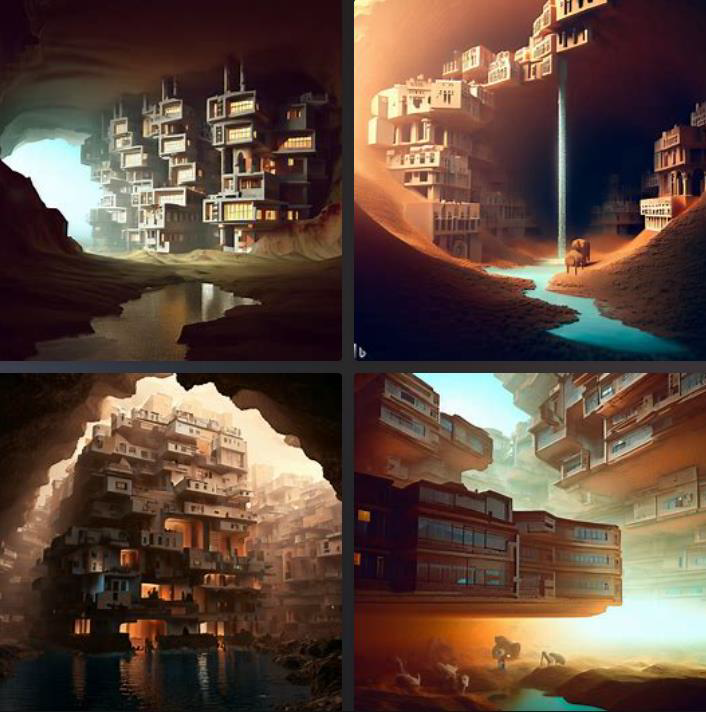 [TEXT] digital art, 3d render, building in underground space like meerkat cave, apartment houses, meerkat cave