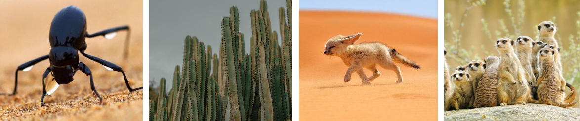 주로 사막에서 생존할 수 있는 것들로, 왼쪽부터 나미브 사막 딱정벌레, 선인장, 사막여우, 미어캣을 선정했다.