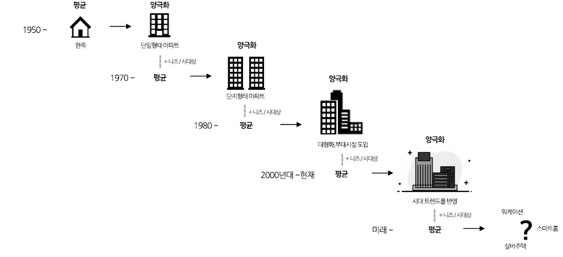앞에서 설명한 여러가지 주거 형태의 역사적 과정을 처럼, 소비자의 요구사항과 시대 상을 반영해 차별화된 주거 형태가 나타났고 차별화된 주거형태는 결국 다음 세대의 보편화된 기준이 되어 또 다른 변화를 만들어낸다는 사실을 보았다. 결국 경제적 양극화로 인한 새로운 상품 개발이 이후에 평균이 되는 것으로 보아, 더 나은 발전을 위한 기준이 되는 것은 아닌가 하는 생각이 든다.